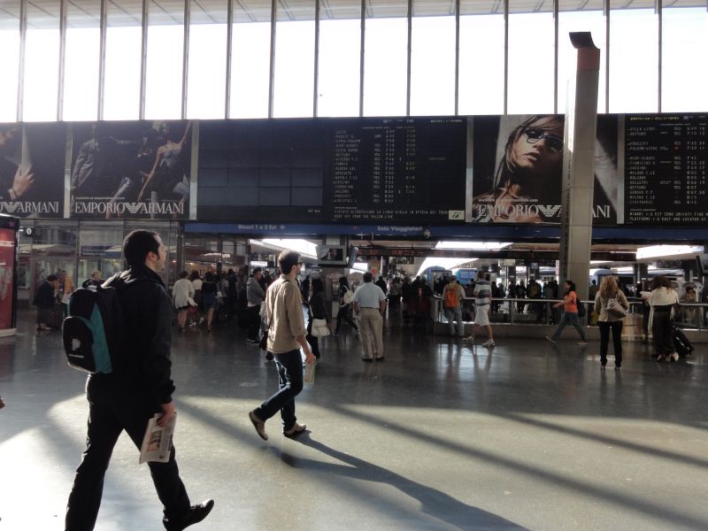 朝、ホテルの食堂でおいしい朝食を取り、そのままテルミニ駅まで歩いて行きました。もう慣れてきた道ですが大きな荷物を持っているし、こんな時によく窃盗に合うとWEBなどに書いてあるので少し気を引き締めて歩きました。しかし、何も起こりませんでした。駅に着いて電光掲示板を見ると軒並み列車に遅れが出ています。