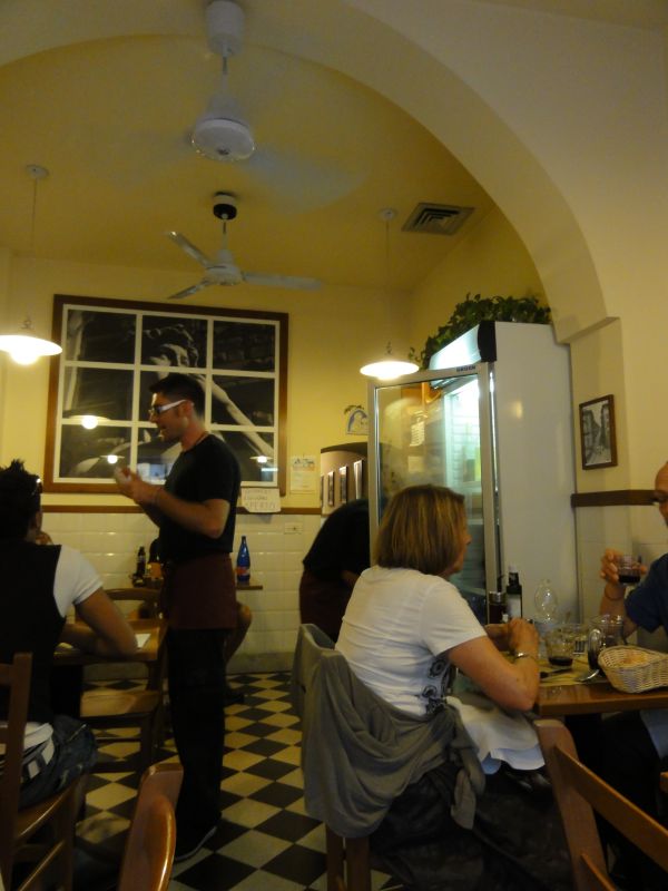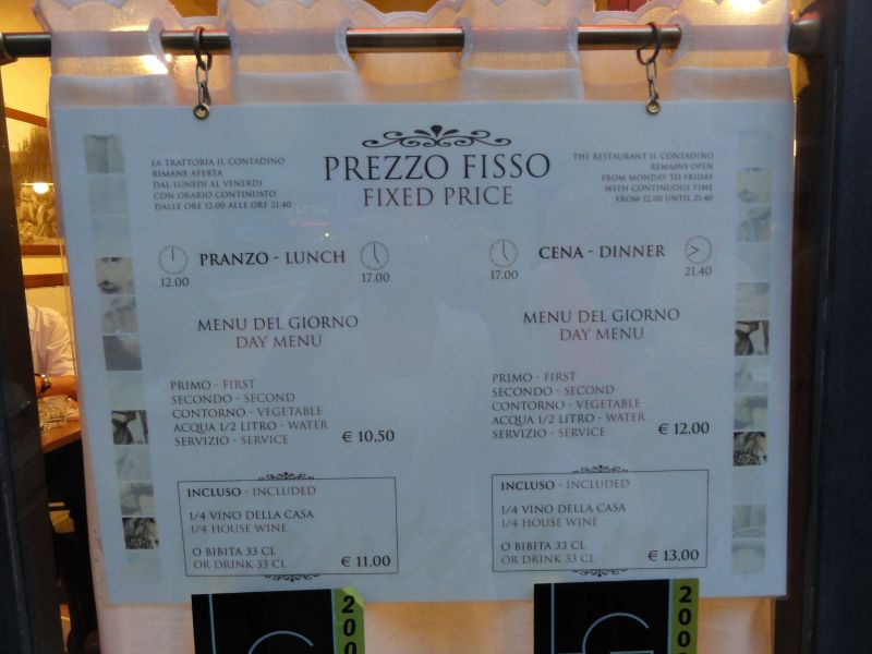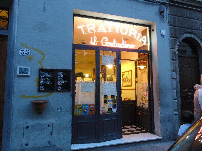 最後の”晩餐” 今日はフィレンツェ滞在最後の夜で、夕食をどこで食べようかとホテルであれこれ考えていたのですが、できるだけ近いところで探そうということになり、ガイドブックに載っていた中で比較的ホテルに近い「トラットリア・イル・コンタディーノ」に決めました。携帯のマップを見ながら、サンタ・マリア・ノベッラ教会の前の広場を横切ってPalazzuolo通りに行き歩いていると繁盛しているお店がありました。そこが目的のレストランでした。