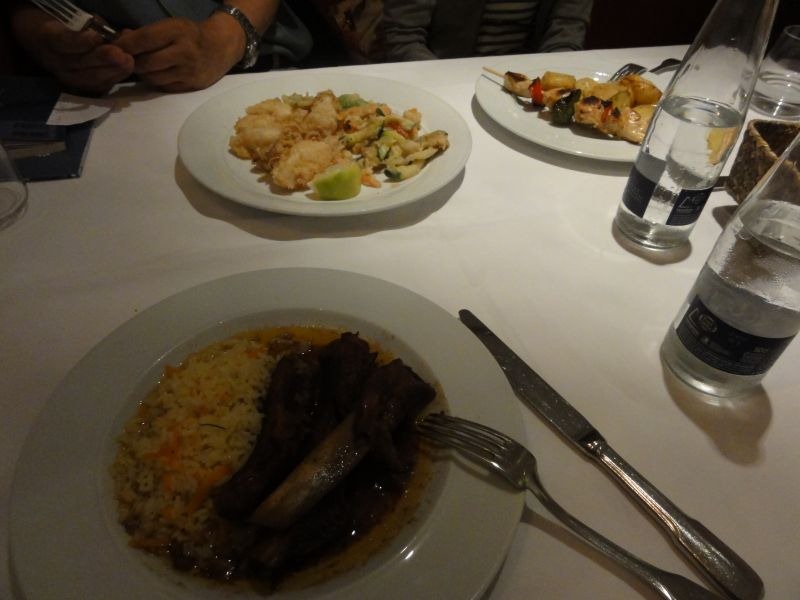 ンピースのソテー 主菜:ピラフスペアリブのせ、イカと野菜のフリッター、チキンとパプリカの串焼き デザート:パンナコッタチョコレートソースがけ 飲み物:ミネラルウォーター、ワイン それぞれ1つ選んでセットメニューになっているんですが、これが一人前9.4€(税込)です。食後のコーヒーは1.25€で飲めます。店内の雰囲気も高級感が漂っていますし、ウェイターのサービスも不足のない感じでおすすめでした。そのあとホスタルに預けていた荷物を受け取りに行きました。その時レストランの件で世話になったので受付の女性にチップを渡そうとしたら、チップは受け取れませんとはっきり断られました。なんでもチップが当たり前と思っていたので新鮮な印象を受けました。