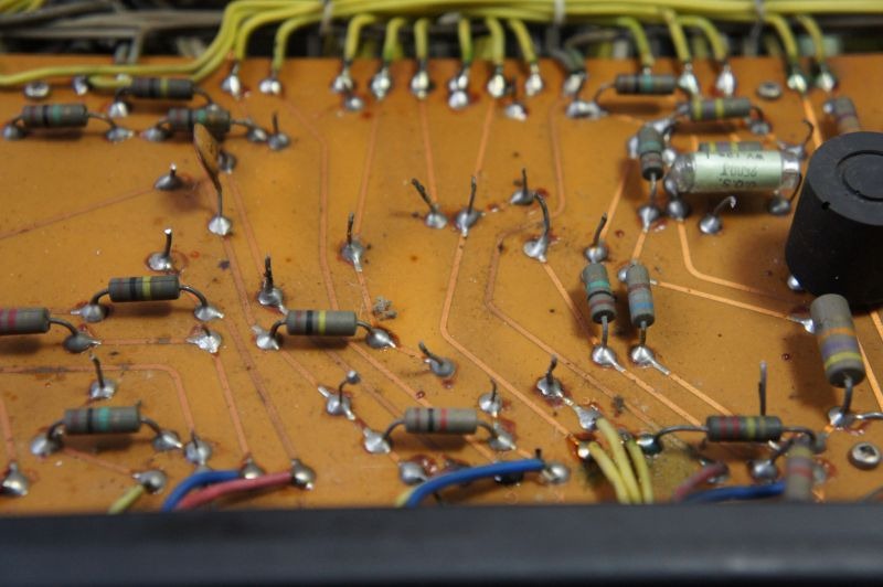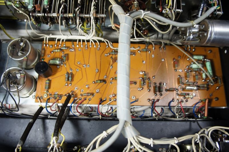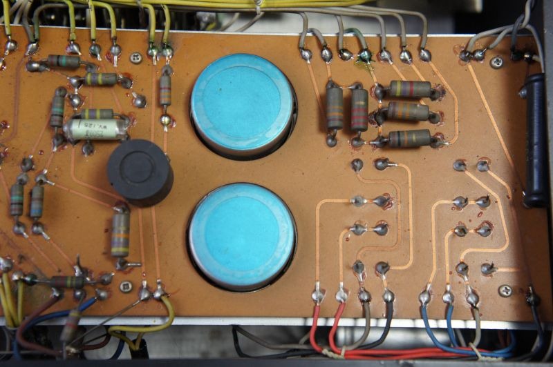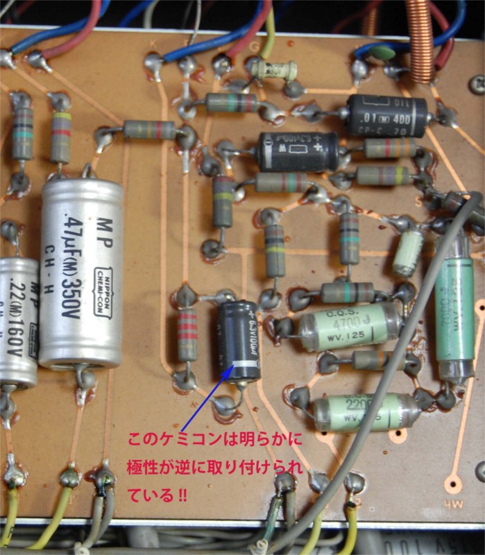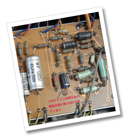この作業の前の段階で思わぬことを発見しました。それはメーカーによる組み付け工程のミスです。V2aという2段目のLEFT側の真空管(12AX7)のカソードバイパスのケミコンが逆に取り付けられていました。このアンプには一切改造した痕がないので、明らかにメーカーのミスです。あまり電圧がかからないところだったので今まで故障もせずに発見されなかったのでしょう。でもLUXでもこんなミスをするんですね。びっくりしました。