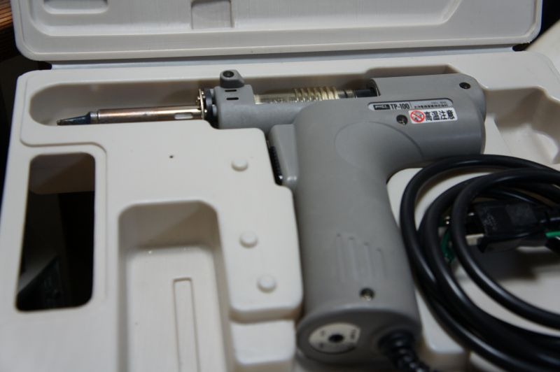 リード線の部分が残っているので、これを取り外さなければいけませんが、半田ごてでやっているとプリント基板のパターンを痛めてしまいますので、ここは便利な半田吸い取り器を使います。これを使うことによって能率が格段に良くなります。