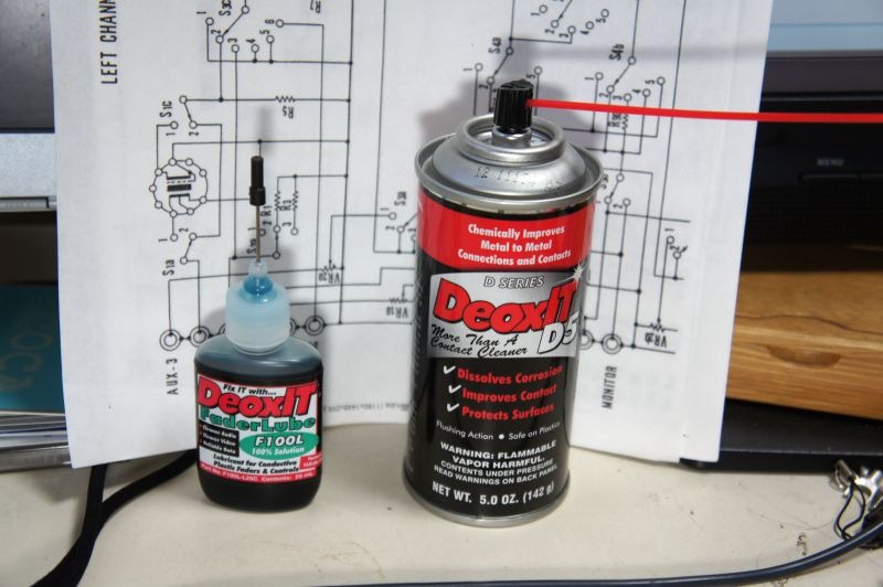 ノイズやガリの原因となる接触不良をなくするために接点洗浄・復活剤としてCAIG社のDeoxIT D5を使っています。以前はDeoxIT F100Lという液体のものを使っていたのですがどうしてもVRやSWの奥の方まで洗浄できないので今はスプレータイプのD5を主に使っています。効果はかなりあります。今回もノイズはほぼなくなりました。最終的にハイカットフィルターSWを上下に切り替えた時にハム音がしていたのがスプレーすることによって完全になくなりました。嫌な臭いもしないのがいいですね。