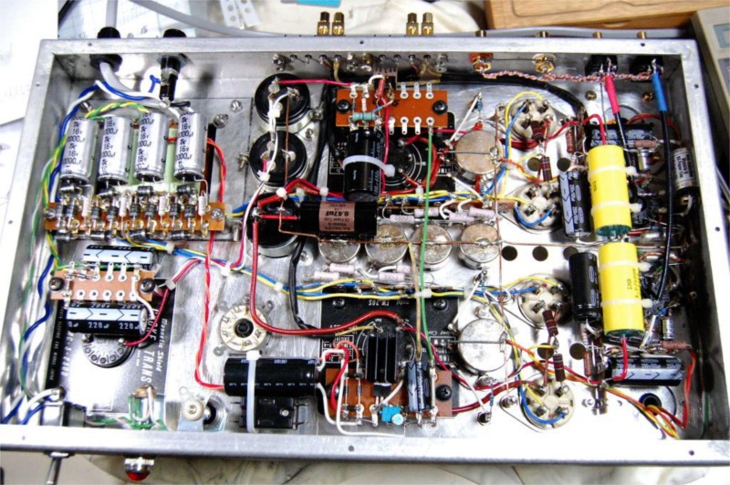 しばらく聴いていると高域の伸びががちょっと足りないと感じました。色々原因を探っていたらどうもドライブトランスの2次側の結線が逆になっていることに気が付きました。反転アンプと同じ結線にしていたために高域がかなり早くから減衰していたようです。グリッド側に黄色、アース側に橙色のリード線をつなぎました。それと同時にグリッドに-C電源を加えるのもやめました。歪率を気にしなくてもいいので、ややこしいことはしない方がすっきりします。おまけに管球王国66号に載っていたのをまねてFETリップルフィルターの出口に0.47µのVITAMINQを加えました。いろいろ修正したので最終