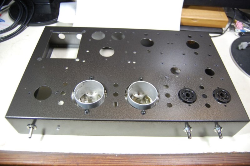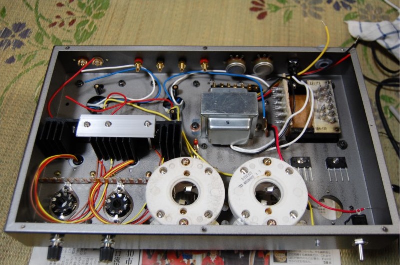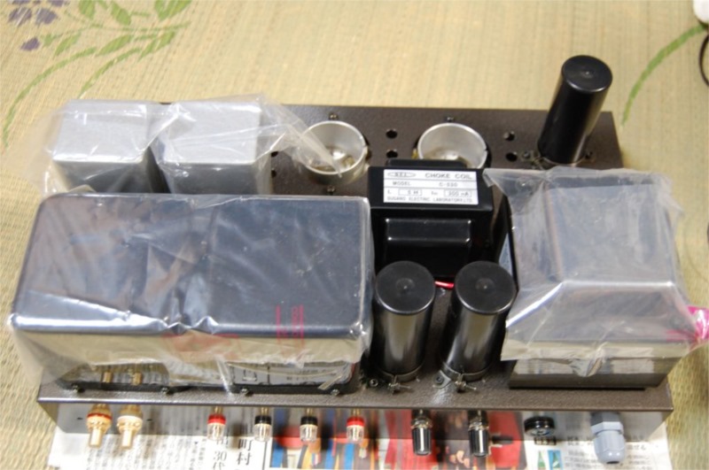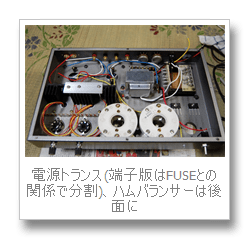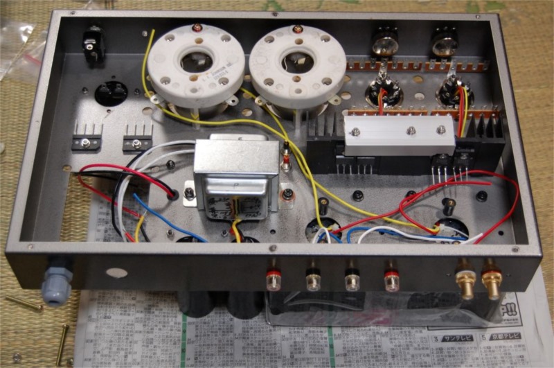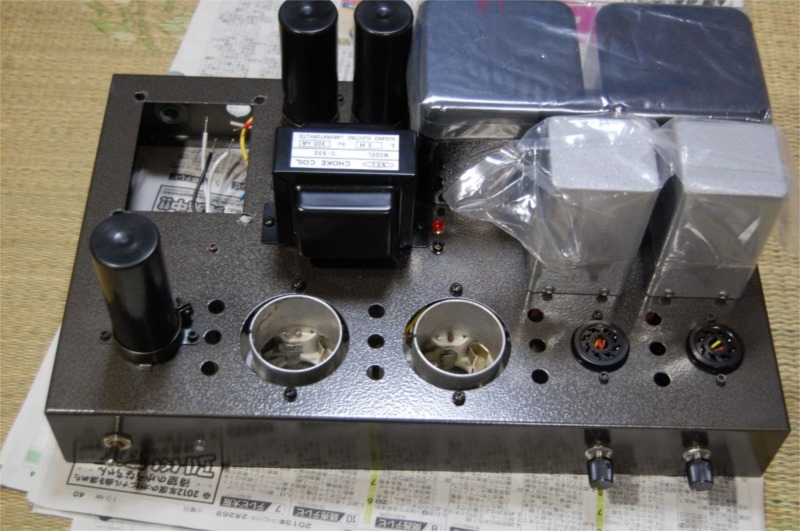 電源トランスはかなり重いのでそれ以外の部品を先に取り付けていきます。この状態でもかなりの重さです。電源トランスを載せたら、おいそれとは動かせなくなると思います。