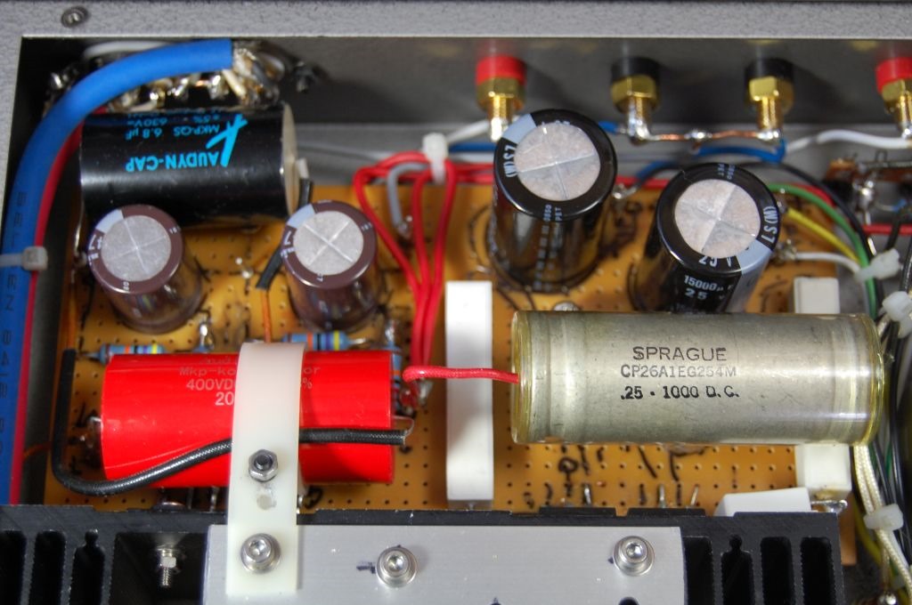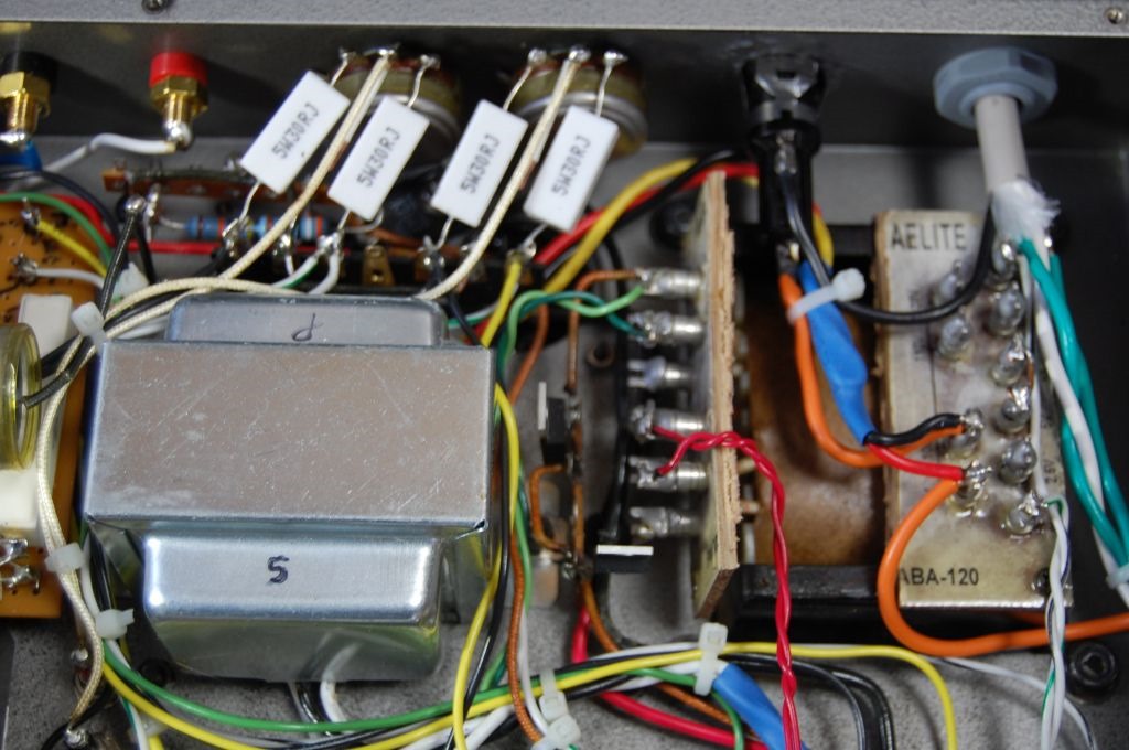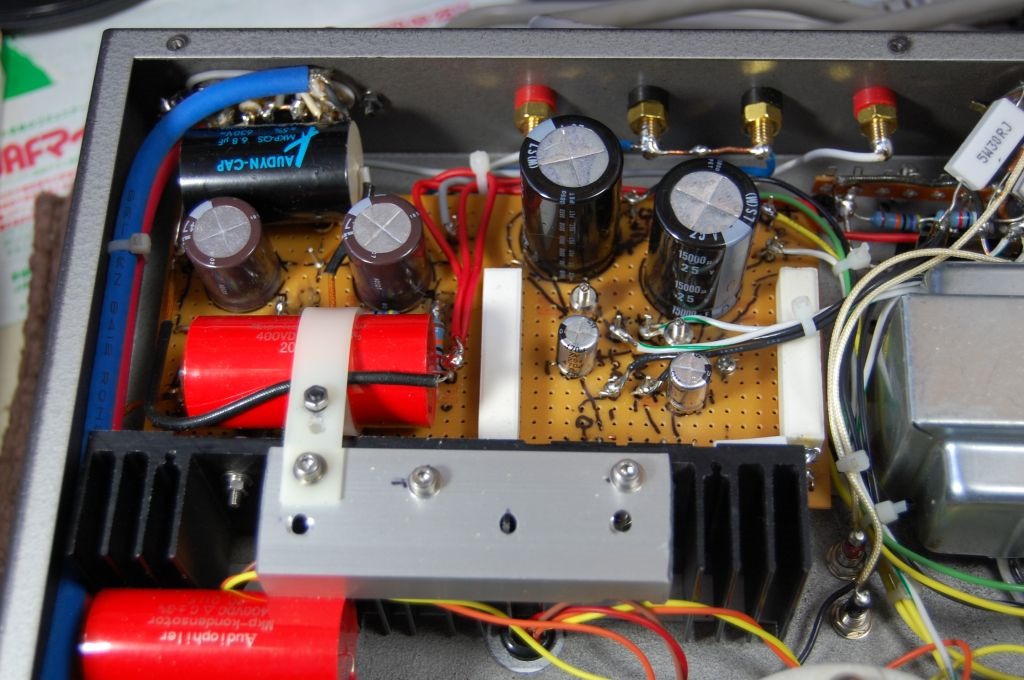 いろいろ苦労しましたが、内部の配線が完了しました。最初B電源をつながずに電源を入れてFET遅延点灯回路のチェックをしました。するとRch側が点灯しません。点検するとRch側のFETの半田付け不良でした。次に両方点灯したので半固定VRで遅延時間の調整をしてからフィラメント電圧を計測するとLchが11V、Rchが9Vです。フィラメント電圧の調整は10Wのセメント抵抗を追加するか取り換えるしかありません。Lchは0.11Ωを追加すると9.9Vになりました。Rchは適当な抵抗がないので、購入するまでしばらくこのままでいきます。