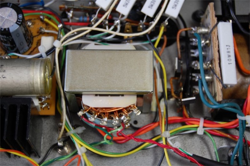 しばらく慣らし運転をしているとシャーシが極端に熱くなってきました。いろいろ触ってみると別トランスにしたヒータートランスが最も熱くなっているように感じたのでヒーター配線を変更することにしました。電源トランスには5V/4Aと6.3V/4Aという巻線がありそれぞれをパイロットランプと6EM7のヒーターに使用していますが、これをシリーズにして211のフィラメント用に使い、別トランスとして6.3V/3A程度のヒータートランスを付けて6EM7とパイロットランプ用に使うことにしました。トランスはノグチトランスのPM-H2にしました。