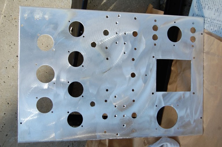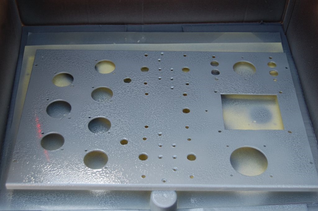 ヤフオクで落札したシャーシは袴の部分は黒の塗装がしてあり天板、底板は無塗装でした。天板はグレーのハンマートーン塗装に、袴の部分も塗装の汚い部分があったので黒のつや消しで再塗装することにしました。他にEDCORのトランスカバーは原色の青のような色なので、落ち着いた濃い茶色に塗装し直すことにしました。