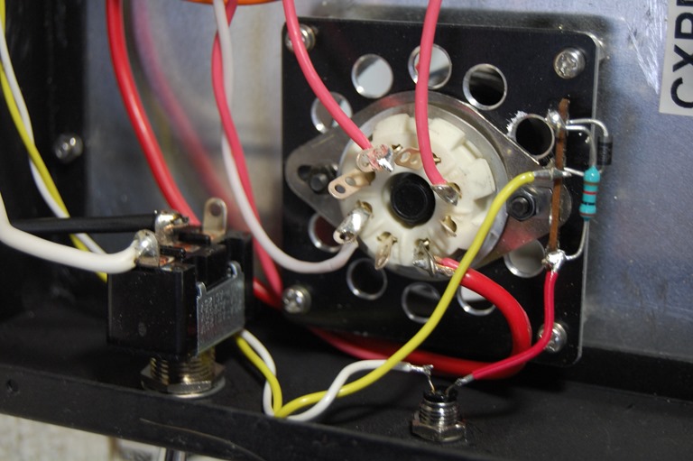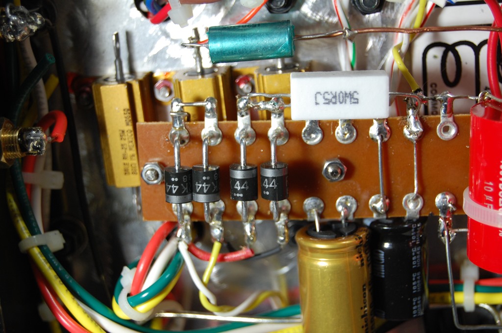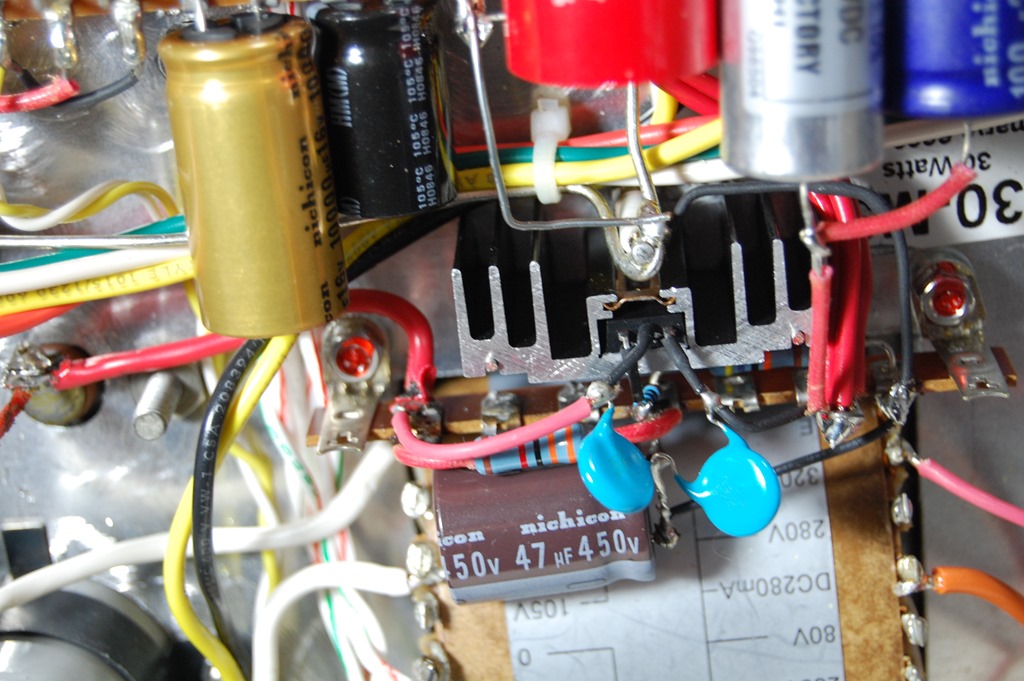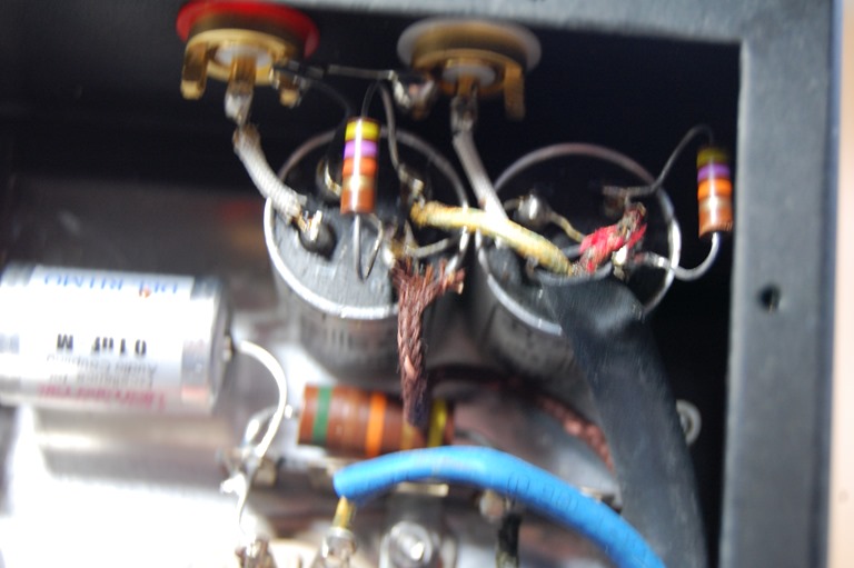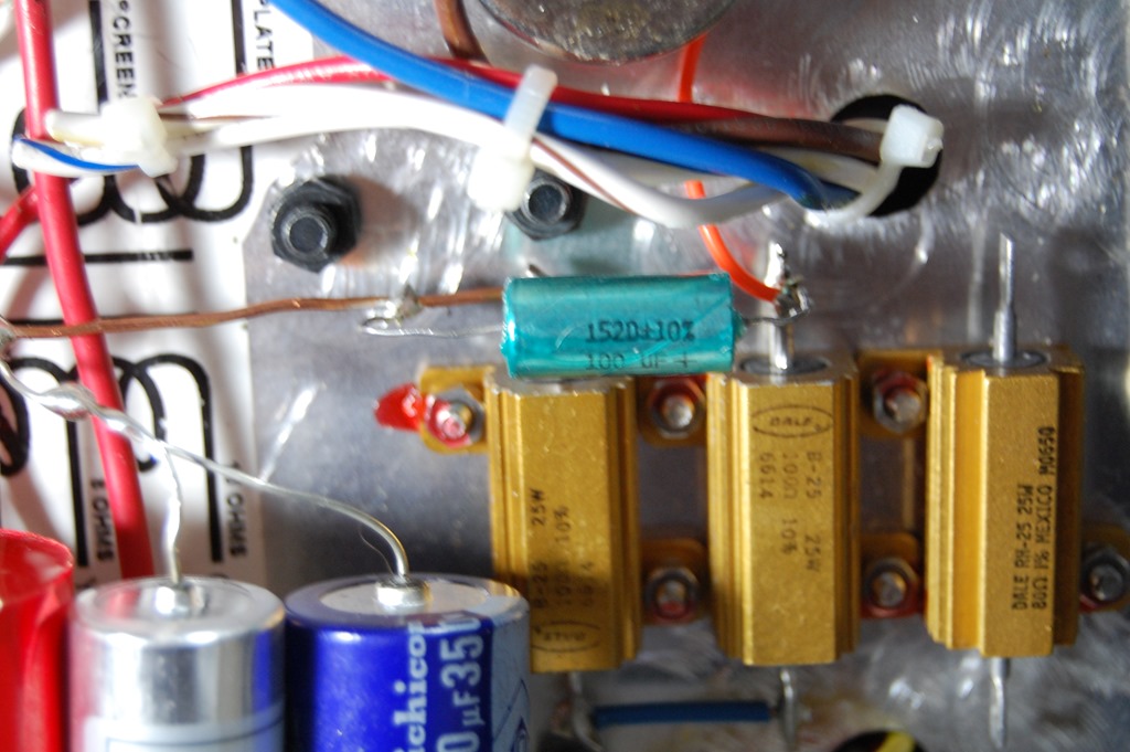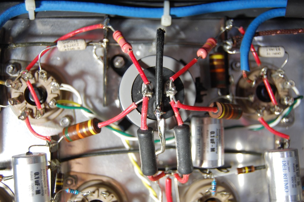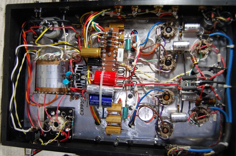最初は電源からのハムと思い、FETリップルフィルターを付けてみましたが効果なし。次に寄生発振か何らかの配線間の飛びつきによる発振など考えて対策を取ってみましたがこれも効果なしでした。ここでそのノイズの周波数をテスターで測ってみると60Hzでした。ということはトランス間の電磁誘導によるハムかフィラメントからのハムしか考えられません。今更トランスの配置は変えられないしと思い、アウトプットとチョークをケース密閉式に交換しようかとも考えチョークは入手までしましたが、その前にフィラメント部分の配線(ソケット、ハムバランサー、カソード抵抗)を再度見直すことにしました。配線を前に製作した2A3ウィリアムソンアンプと同様に変更し、ハムバランサーの両端に22Ωを追加しました。(この間試行錯誤で何週間かが過ぎました。)そして計測してみると左チャンネルはほとんどノイズが出ていません。そこで考えたのがノイズは1619自体に起因する(ペア不揃い、不良品etc)のではないのかということでした。試しにヤフオクでペアとして出品されていたRCA製の1619に右チャンネルをかえてみたところノイズが激減しました。ひょっとしたらソケットの接触不良もあったかもしれませんが、何はともあれハムバランサーの調整でノイズが両チャンネルとも2mv以下になりました。これでやっと音質を追い込んでいくレベルにたどり着いた感じです。入力感度も少し低いようなので、6SN7のプレート・カソードの抵抗値を調整してみる予定です。