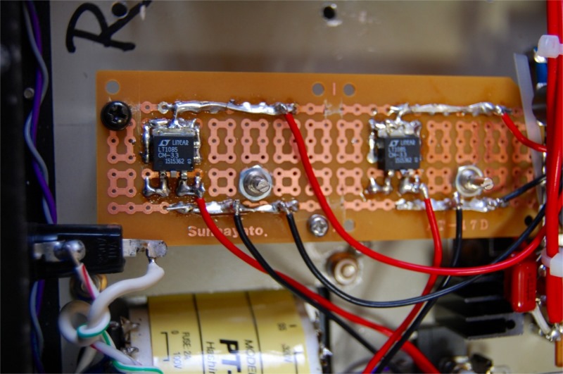 ではどうしたらいいのかということで、ネットで情報を集めていたらLINEAR TECHNOLOGYという会社のレギュレーターIC(/LT1085)が1Vドロップアウトで動作するということがデータシートに書いてありました。しかしこれを販売しているところが国内でなかなか見つからず、やっとのことで三共社という会社を見つけました。ところが通販で売ってもらえるのは外形がDDというプリント基板に半田で直付けするタイプだけでした。それでもなんとかなるだろうと思って購入しました。@507で購入できました。(後でもっと検索していたらレオコムLEOCOMという国内の会社がTO-220タイプ5AのLT1084を@800程度で販売していることがわかりましたのでこれも購入しました。)これで試してみるとうまく規定の電圧になってくれました。さすがLT1085、LINEAR TECHNOLOGY様様です。