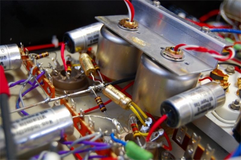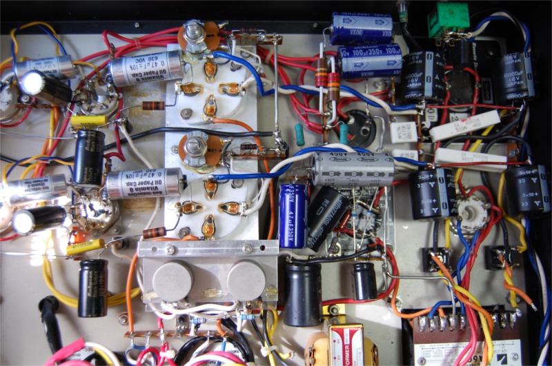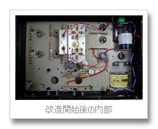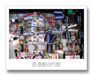 改造の第1段階は不必要なパーツを取り除いていくことです。しかし電源トランス、出力トランス、ブロックコンデンサー、真空管ソケットの大部分を交換することにしたのでほとんどの部品を取り外しました。