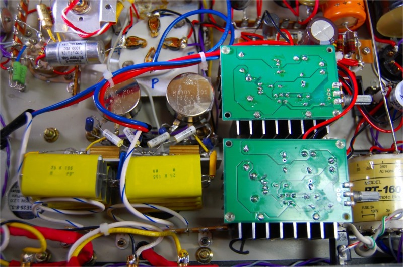 幸いなことに8A60とPT-160はほとんどサイズが同じで取り付け穴をやすりで多少広げる程度で交換できました。苦労したのはグリッドチョークとスイッチング電源の取り付けです。