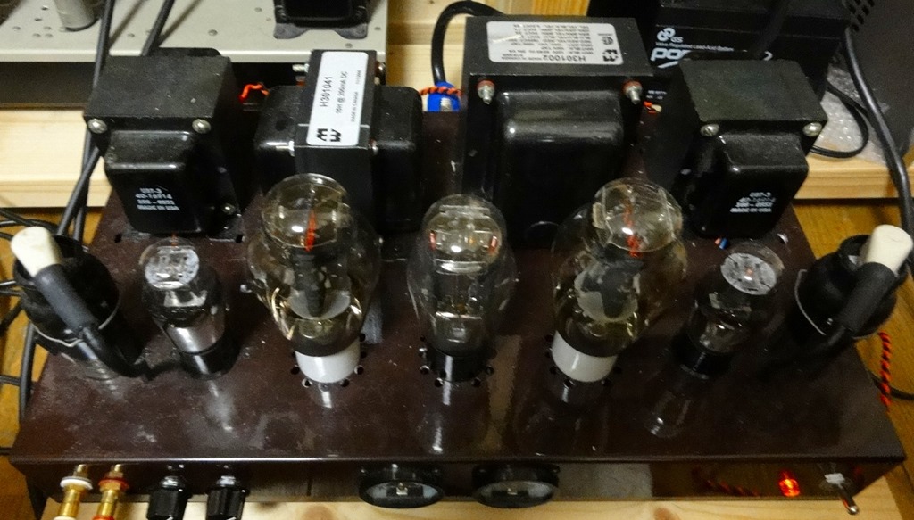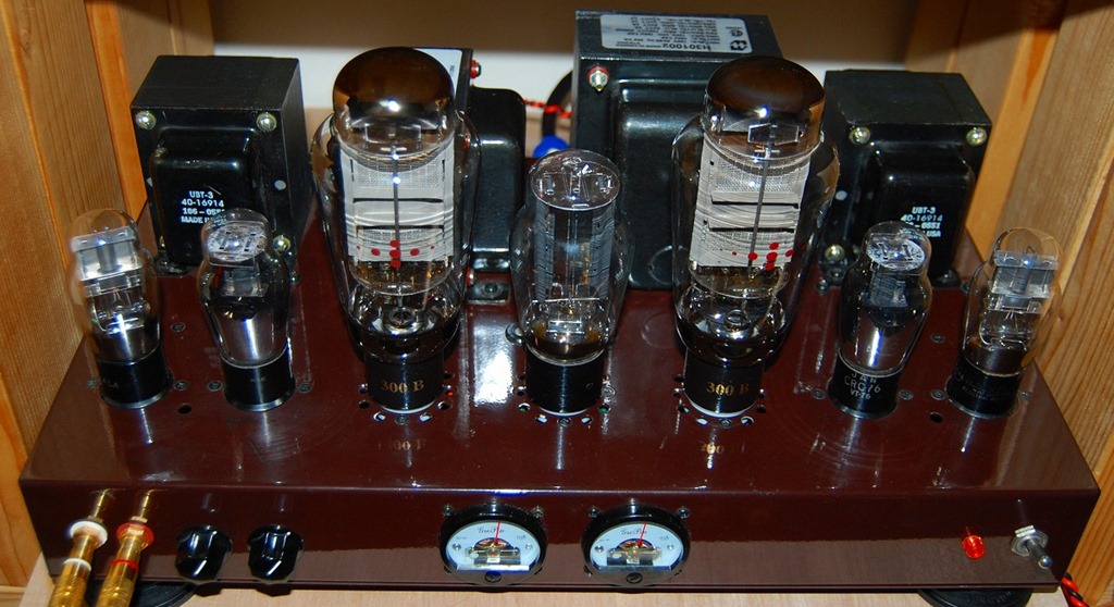 このアンプはご存じの方ならすぐEiflというオーディオ店の販売したものに似ているとDSC_0008おわかりになると思います。その通りですが、私はこのシャーシのみをオークションで入手して、必要な部品を集めて自分流の300Bアンプを作りました。ただ回路は浅野氏の回路を基本にしています。電源トランスとチョークはEifl規格のHammond製を購入しました。出力トランスは一度使ってみたかったOne Electron製のUBT-3をアメリカから購入しました。DSC00919取り付け穴はちょうど合うようになっています。オリジナルと大きく違うのは初段管です。オリジナルでは75を使うようになっているのですが、トップグリッドの球を使ったことがなく、私の処理がまずいのかハムを拾うので、75からすぐに似たような特性の6ZDH3Aに替えました。フィラメントを通常のダイオードで整流した時の音はまさに中庸であり、なおかつ高音の響きが素晴らしいと感じていました。スイッチング電源に替えた時の印象は音の出方がまるで変ったかのように感じました。なにか音があふれて飛び散っているような感じがしました。DSC_0006よく言えばエネルギッシュでダイナミックな音、悪く言えば前と較べて荒っぽさを感じさせるような音と言えるでしょうか。本来のWECが目指した音はどちらだったのでしょうか。未だにどちらを取るか判断に迷います。そして今はEmission Labs社300B-meshという真空管にかえて試聴を続けています。この印象はWE300Bと非常に似ていますが、少し落ちついた雰囲気を感じます。なかなかいい真空管だと思います。このアンプでWE以外で他になかなかいいと感じた300BはKRがあります。これも作り、音質ともお薦めできる球です。KRの300Bはフィラメントがオリジナルと同じ規格(5V 1.2A)でそのまま差し替えできます。ただし末尾にXLSとか付いたものはまったく別物(5V 1.8A)です。