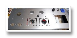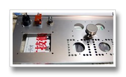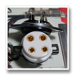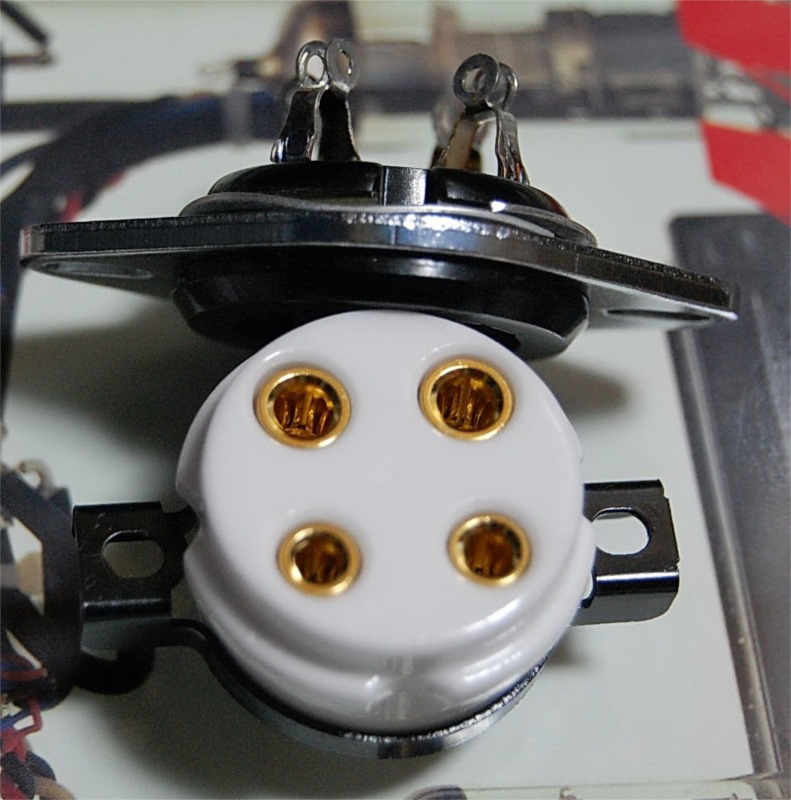 したときにオリジナルの寸法図にはアンフェノールタイプのソケット用に寸法が決められていましたので、余り検討もせずソケットはその寸法で穴あけしてしまいました。しかし、再検討していくとどう考えてもアンフェノールタイプのソケットより、真空管のピンを全体で圧着する新しいタイプのソケットの方がトラブルが起こりにくいように感じ、変更することにしました。ここでアンフェノールタイプ用にあけた穴