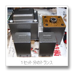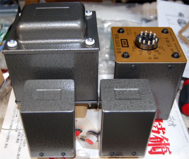 やっと心待ちにしていたISOのトランスが送られてきました。左右2セットのトランスの重みはかなりのものでした。とりあえず出力トランスとチョークトランスだけ取り付けて、すぐにでも配線作業に入れるようにしました。電源トランスは増幅部の配線が完了してからケースの袴(黒い部分)と一緒に取り付けるようにします。そうしないと配線作業の取り回しが極端に面倒になると思われるので。