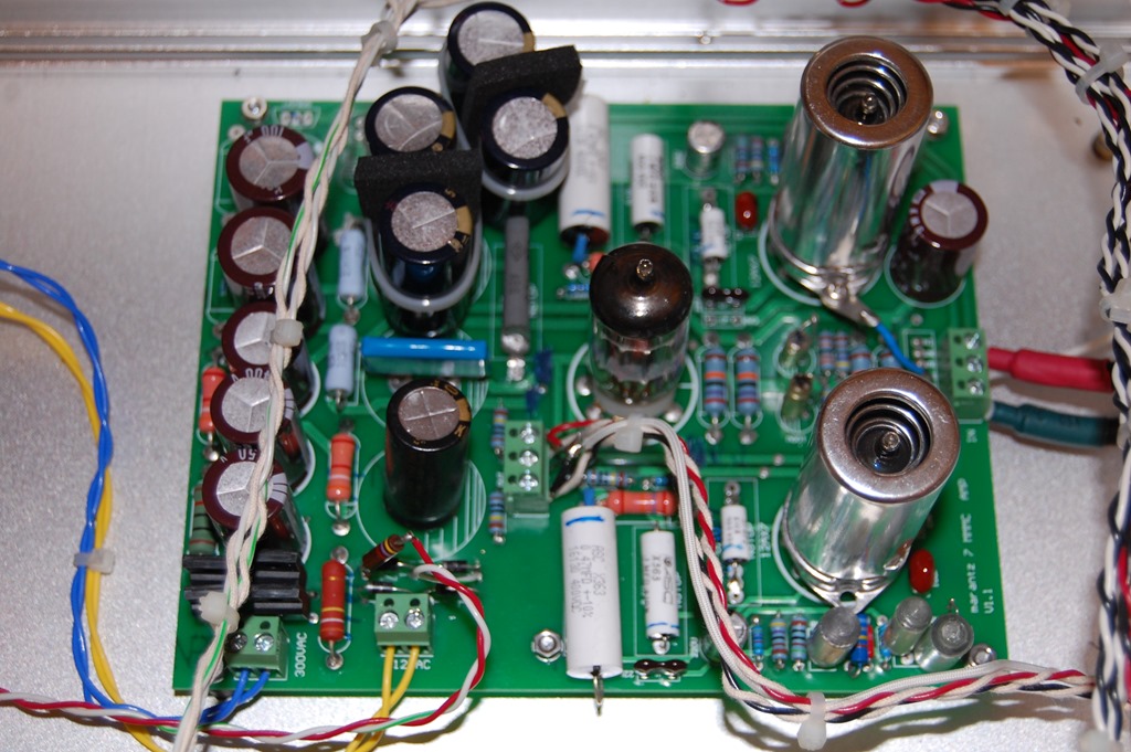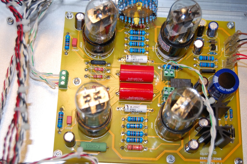 回路が採用されています。ヒーターはACのままでセンタータップに+80Vをかけています。付加回路として出力に遅延式のリレー回路が付いています。これは試聴してわかりましたが、電源ONの時は有効ですが、電源OFFの時は役に立ちません。面白いと感じたのはカソードフォロワーの5W30kΩの抵抗の代わりに1W120kΩ金被抵抗を4本並列に繋いで使用している点です。基板にスペースがあるからできた訳で、放熱的にも音質的にも効果があるのではと思いました。この基板については信号回路のCR類を交換した程度で、あとは付属の部品を使用しました。![]()