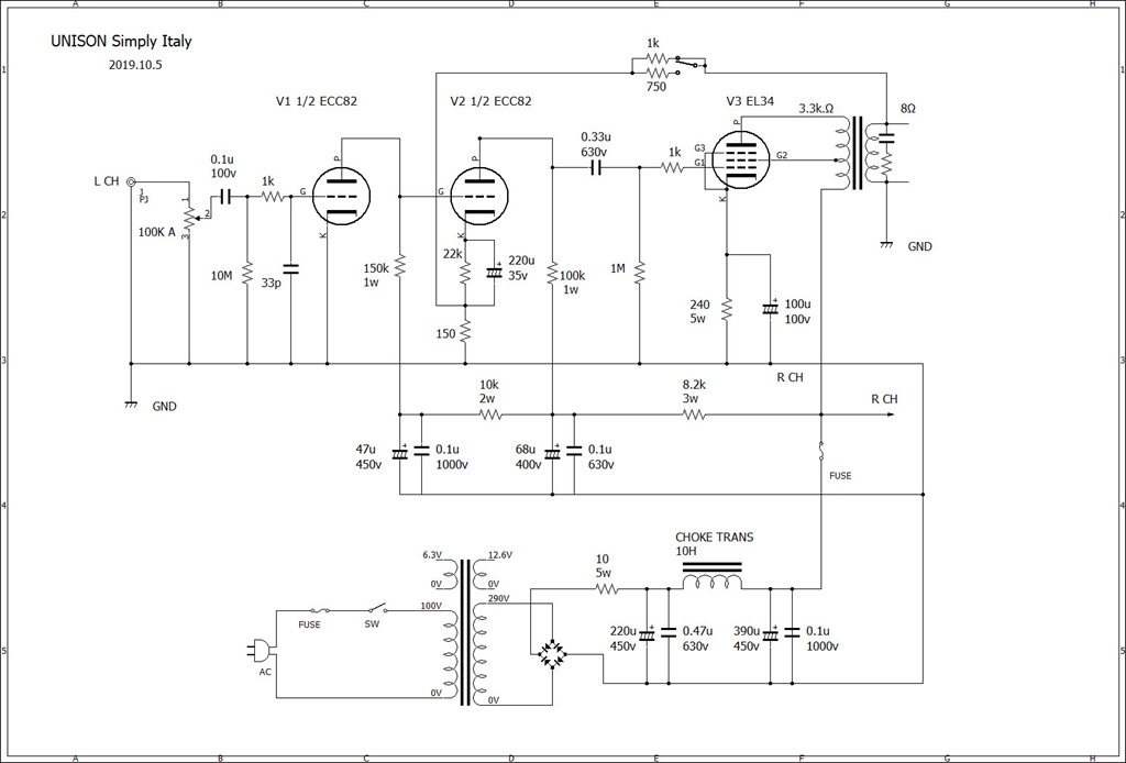 またここでパーツの変更を考えていたので、回路の解析もしておく必要があり、裏表いろいろ眺めながら作成した回路図が以下のものです。100%の確証はありませんが、増幅回路についてはまず間違いないと思います。判ったことはSimply2とはかなり変更されているということでした。![]()