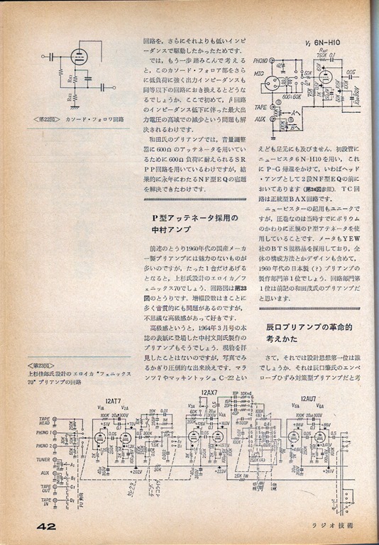 AliExpressでプリアンプ用の基板を見ていると和田真央氏によるManrantz7改良型の回路基板が良く目につきます。回路の特徴は1段目2段目はほぼオリジナルと同じで3段目がSRPP回路になっていて、オリジナルのカソードフォロワーと異なっています。ここで疑問が涌いてきます。和田真央なる人物は実在するのか、その回路はLUXのCL32などと違いがあるのかなど。色々検索してみましたがなかなか中心に辿り着けません。でもその回路が発表されたのが『ラジオ技術1969年2月号』だということが判明しました。残念ながらその号は持っていませんので、ネット上で見れるところはないかと探しましたが、国立国会図書館の蔵書にあり、閲覧可能になる予定だと書いてありましたが、現時点では著作権等の調整中で閲覧不可でした。諦めかけて最後に自分の所有しているラジオ技術社発行の『集大成プリアンプ』という本の記事を見ていくと「プリアンプ回路設計の系譜」(是枝重治氏著)という記事の「第4章ユニークなアマチュア作品群」という中になんとその回路が取り上げられていました。ラッキーです。これでAliExpressで売っている基板で一度試してみようという気になりました。