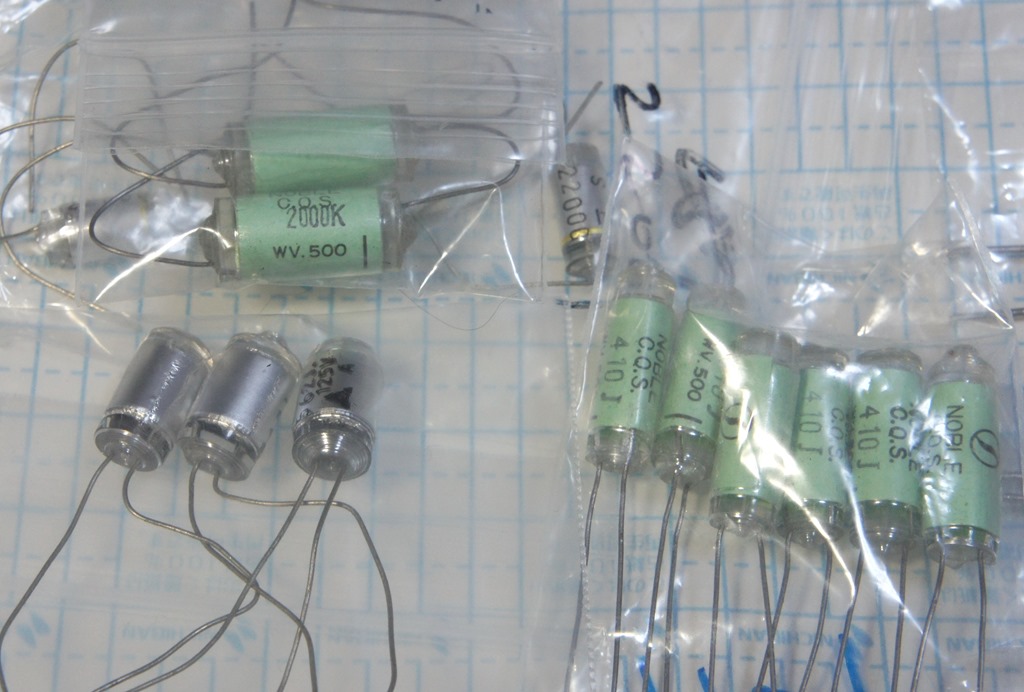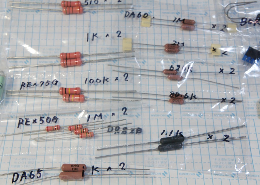 製作の為にはまず部品集めです。この時が一番楽しいときかもしれません。色々な部品が集まってくるとそれだけでワクワクします。今回は半導体は手持ち部品、フィルムコンデンサーはAmazon、電解コンデンサーはヤフオクとRSコンポーネンツ、抵抗と真空管ソケットはGarrett Audio 、EQ部のスチコンは手持ちという形で集めました。