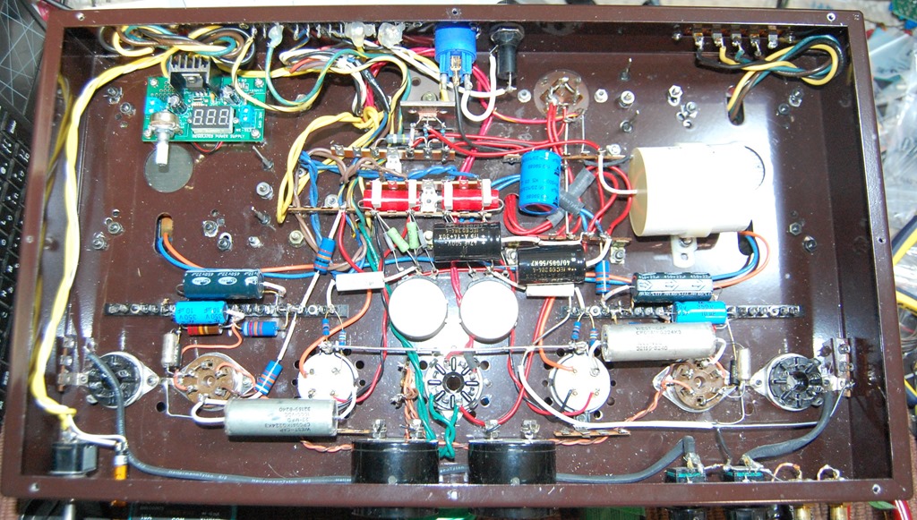 部品がほぼ揃ってきたので、新しい回路を配線していきます。入力トランスを組み込むつもりでしたが、入力のシールド線が無駄に長くなってしまうので、今回は外付けに変更します。両側の一番外側のソケットが空いてしまい、見栄えが悪いのですが仕方ありません。コツコツ配線して8割かた終わりました。写真の左上に写っている基板はマルツのLM317を使用した3桁7セグ電圧計付き1.5A電圧可変電源キットです。10Vヒーター用に使います。右側に光って見えている大きな円筒形のものはASCのフィルムコンデンサー(40μF330VAC)です。![]()