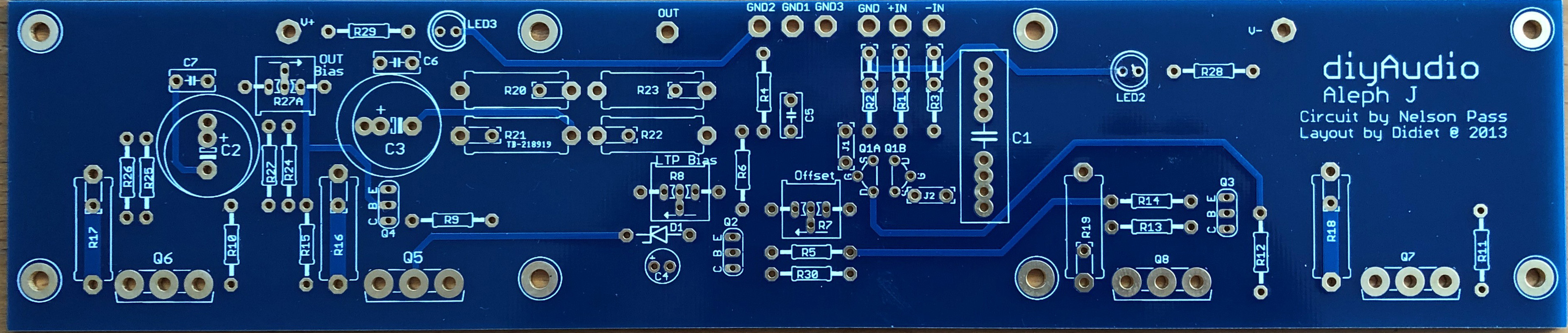 Nelson Pass氏のA級アンプ第2弾はThe diyAudio Store製の基板を使ったPass Aleph Jアンプです。結論からいいますと電源トランスの選択を間違えて規定の電圧を得ることが出来なくて少し低い電圧で動作させています。基板への供給電圧は24VとなっていましたのでBlock トロイダルトランス,1次:115 V ac, 230 V ac,2次:2 x 24V ac,電力:500VA というトランスをRSから購入して製作したのですが最終的に供給できる電圧は21Vがやっとでした。特に音質に問題はないのでそのまま使用しています。出力段のMOSFETは前作のFETと兄弟品種のIRFP240です。入力段のFETにはたまたま入手できたDualFETの2SJ75(2SJ74をペアにしたもの)を使用しています。前作との大きな違いは電源トランスを左右共通の大容量トランスにしたこと、入力段のFETがIRFU9210から2SJ75にしたことです。