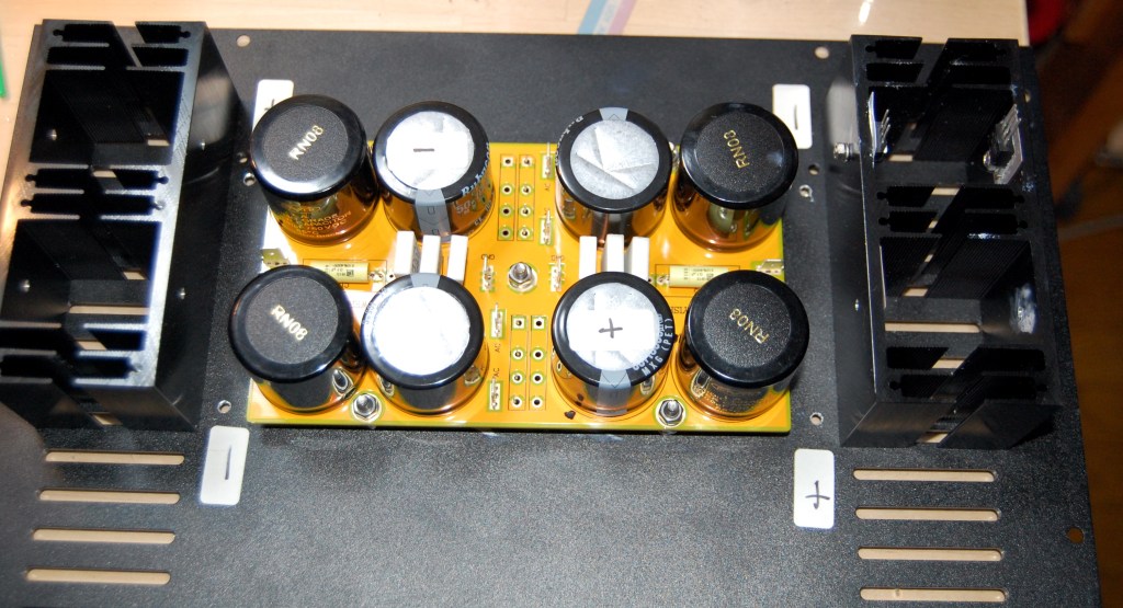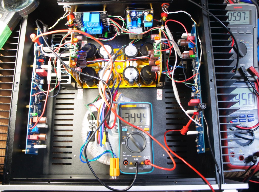 最初電源をSIGMA22で安定化をもくろみましたが、既定の電圧が出ず、FETリップルフィルターに変更するも、最終的にトランスの2次電圧が低すぎて21Vしか供給できないことになりましたがこのまま使用することにしました。アイドル電流は1つのMOSFETに850mA流すよう設定しています。今回はケースを大きめにしたので特にクーリングファン等は必要ない程度の温度上昇で済みました。