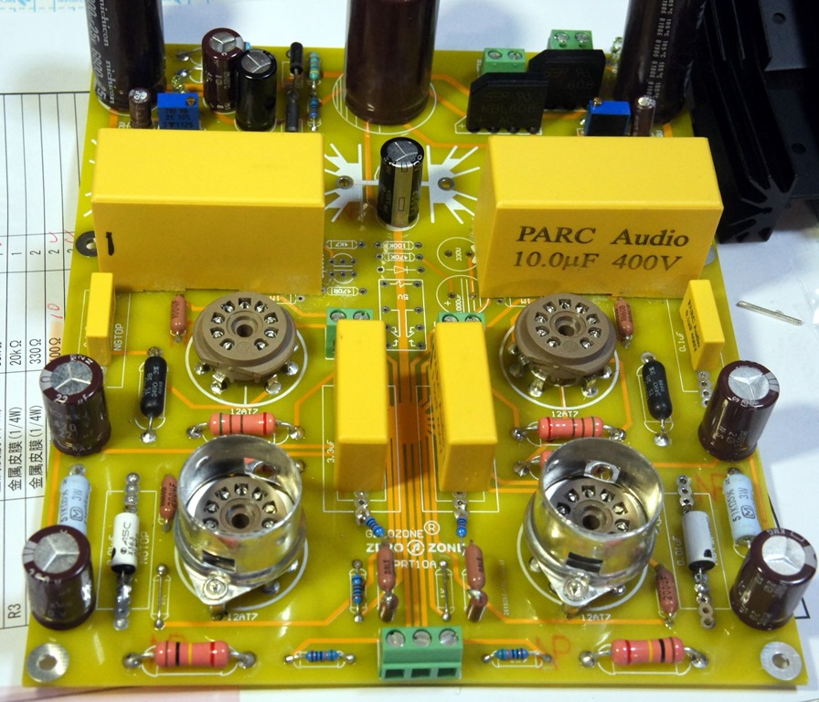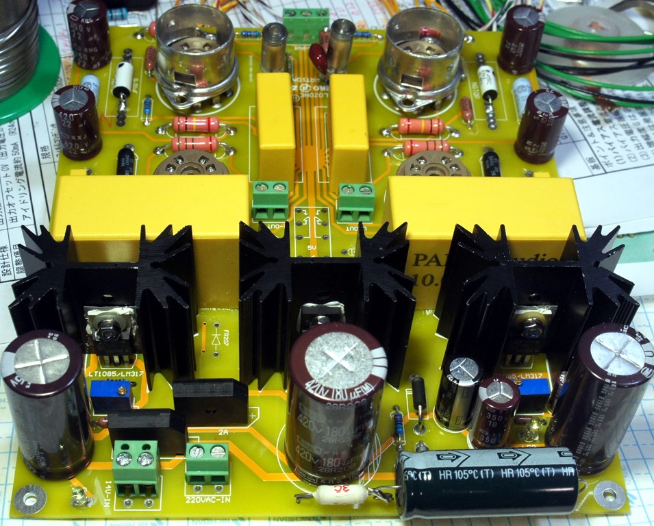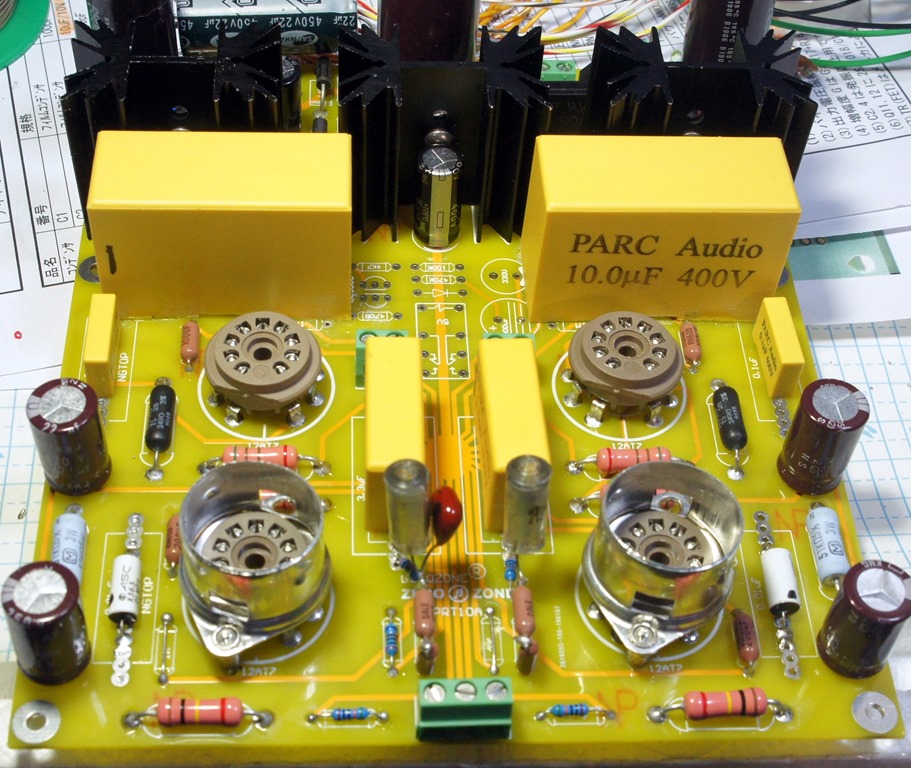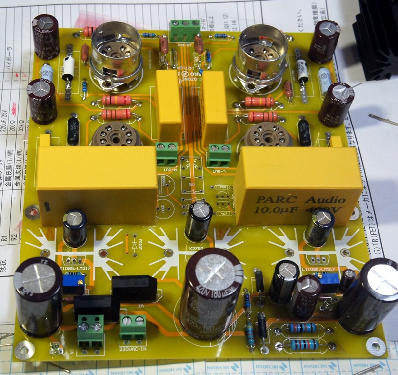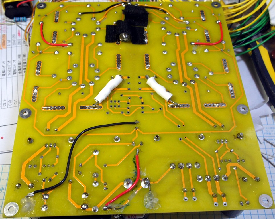 配線が完了し、煙やフューズ断絶などないかとチェック中に色々不備なことが出てきます。最大の不備はチョークから出たところにコンデンサーを入れ忘れていたことです。各部の電圧をチェックして、予定していた電圧と大きく異なる点の抵抗値を変更しました。