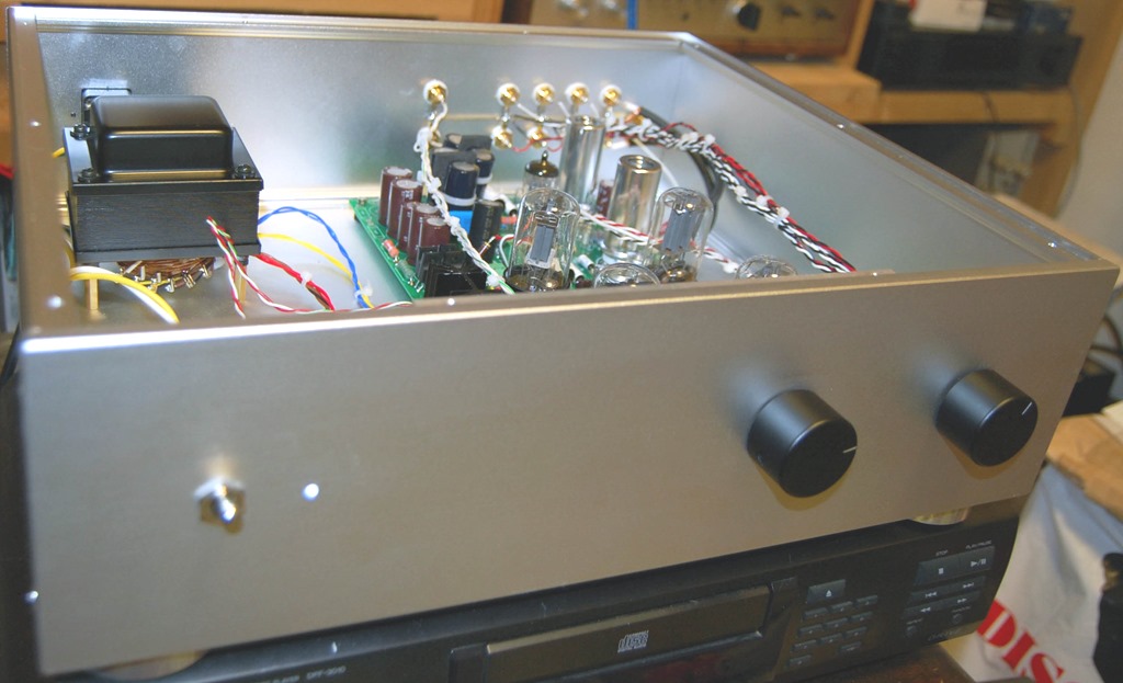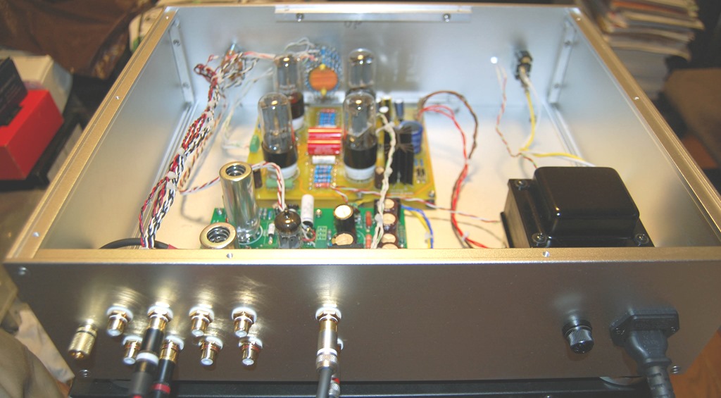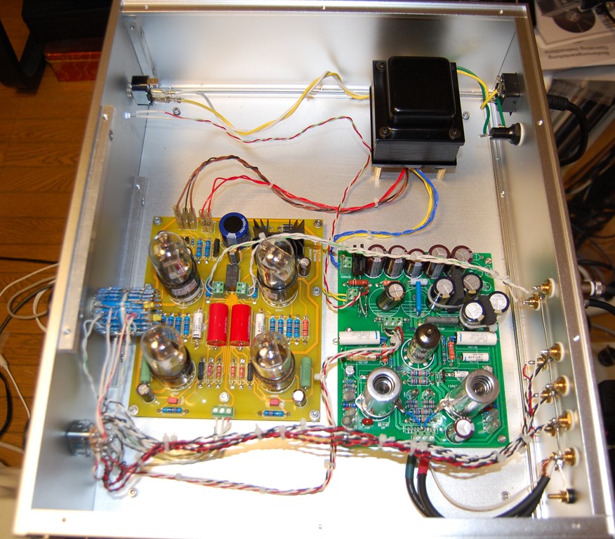 相談された時の改善してほしい問題はノイズということでした。特にジーというノイズが最近するようになったということで、まずノイズの測定を行いました。出力端子に5kΩ:8Ωの余っているトランスを2次側をアンプに1次側を測定機に接続して測定しました。最初は所有者が使用されていたACコード(2線の4m近くあるもの)を使用したところ2.3mvという結構高い値が出ました。次に私のBELDENの3線のシールド付きで2mのコードで測定してみたところなんと0.36mvまで下がりました。ひょとしたらジーという雑音もその辺から由来するものではと思いました。